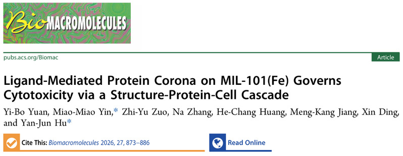 近日,Biomacromolecules(《生物大分子》)在线发表胡艳军教授、尹苗苗副教授团队在纳米生物效应领域的最新研究成果。论文题目为“Ligand-Mediated Protein Corona on MIL-101(Fe) Governs Cytotoxicity via a Structure-Protein-Cell Cascade”(配体介导的MIL-101(Fe) 表面蛋白冠通过结构-蛋白质-细胞级联反应调控细胞毒性)。我院2023级硕士研究生袁一博为论文第一作者,尹苗苗副教授和胡艳军教授为通讯作者,湖北师范大学为论文唯一通讯单位。Biomacromolecules是ACS(美国化学会)出版社旗下的化学领域期刊,SCI中科院大类一区top期刊,最新影响因子为5.4。