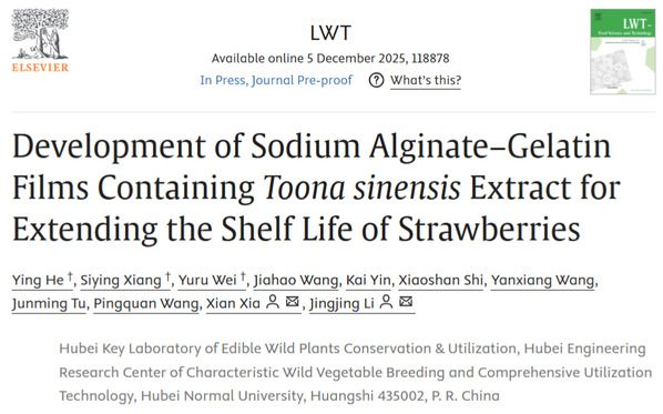 该研究成功制备出基于海藻酸钠–明胶并富含香椿(Toona sinensis)提取物的生物活性薄膜(SGTS 膜)。研究结果显示,该薄膜在抗氧化、抗菌及果蔬保鲜方面表现出显著优势,为绿色食品包装材料的创新提供了新路径。团队通过添加不同浓度的香椿提取物(1:20、1:10、1:5),显著改善了薄膜的结构与光学性质。新型薄膜不仅具备更高的柔韧性和更强的紫外阻隔能力,还表现出良好的亲水性。在生物活性方面,SGTS 膜具有高水平的天然抗氧化能力,DPPH 和 ABTS⁺ 自由基清除率均超过 90%。在抗菌测试中,SGTS 膜对大肠杆菌和金黄色葡萄球菌均表现出增强的抑制作用。此外,在草莓储藏实验中,该薄膜能有效保持果实外观、硬度、pH 和感官品质,并显著降低储藏期间的失重。研究团队表示,该类可降解活性薄膜为替代传统塑料包装提供了有前景的绿色解决方案,未来有望在果蔬保鲜、食品包装等领域得到推广应用。