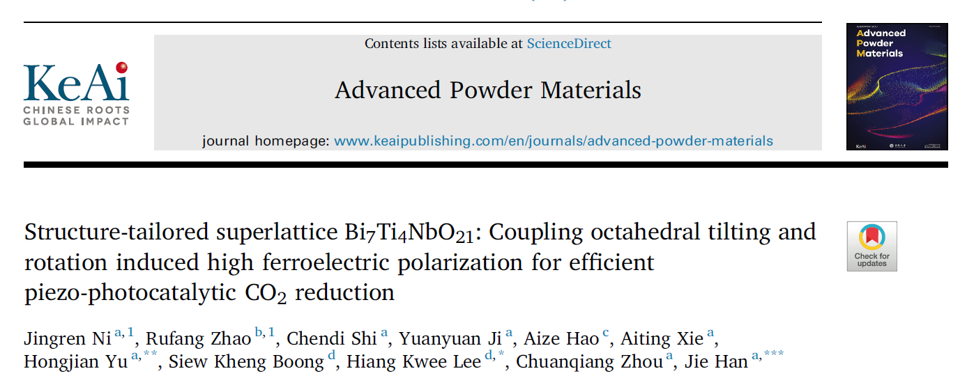 [成果38] 赵茹芳:共生铁电体Bi7Ti4NbO21结构设计:耦合八面体倾斜和旋转诱导的高铁电极化,用于高效压电光催化CO2还原