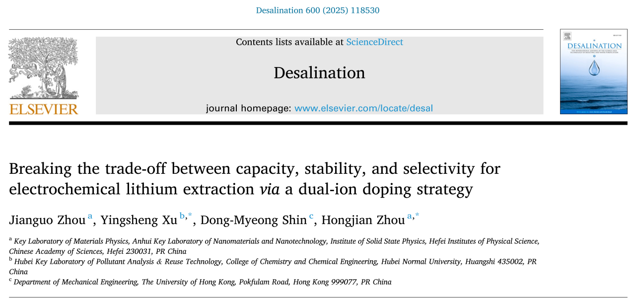 该成果于2025年1月发表于中科院SCI大类一区Desalination(IF:9.8),徐应生博士和中科院合肥物质研究院周宏建研究员为论文共同通讯作者,湖北师范大学为论文第二通讯单位。
