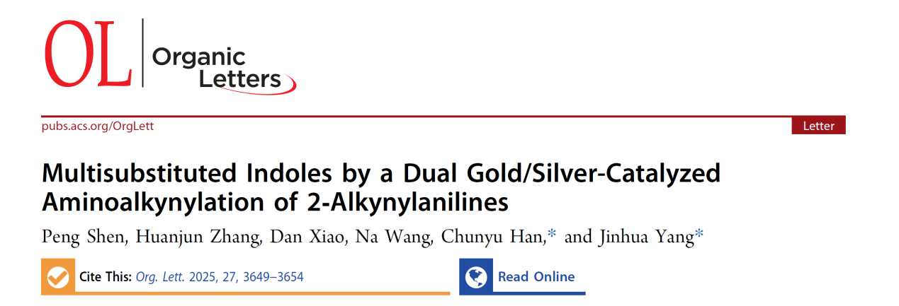 该成果于2025年3月发表于中科院SCI大类一区、自然指数期刊Organic Letters(IF:5.0),2023级硕士研究生申鹏为论文第一作者,韩春雨博士为第一通讯作者,杨进华副教授为共同通讯作者,湖北师范大学为论文唯一通讯单位。