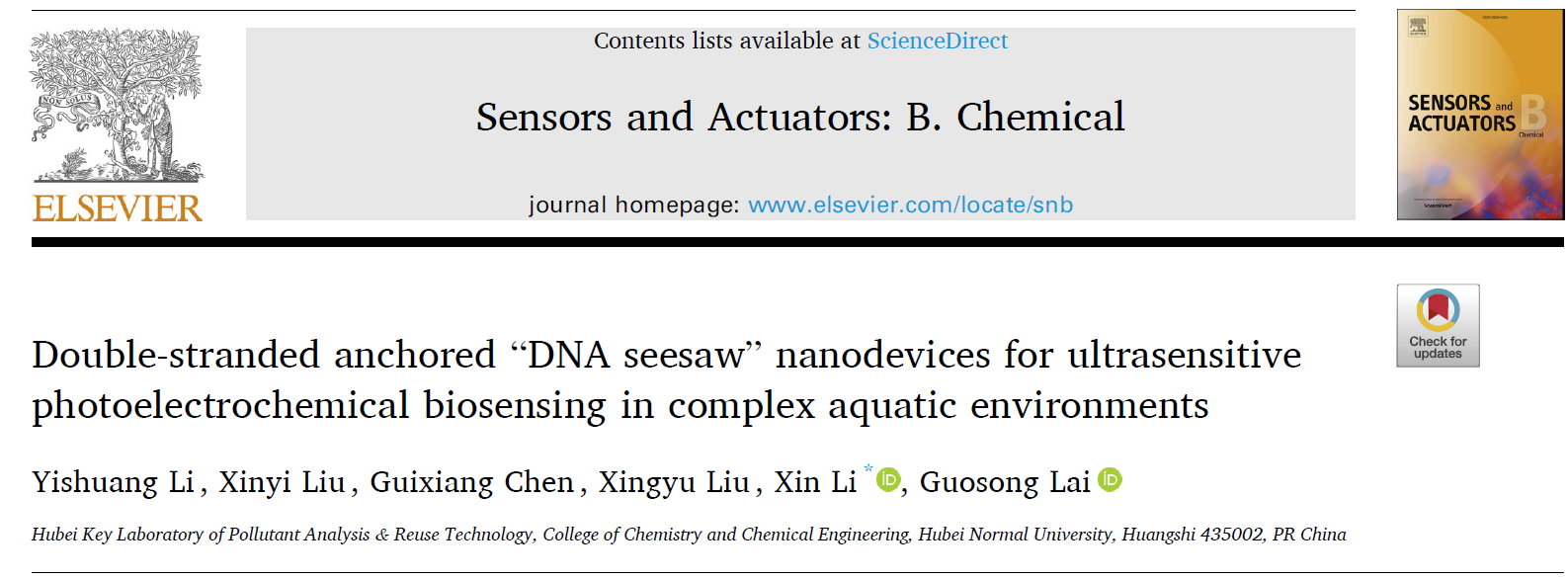 该成果于2025年4月发表于中科院SCI大类一区Sensors and Actuators B: Chemical (IF:7.7),2022级硕士研究生李艺爽为论文第一作者,李新副教授为论文通讯作者,湖北师范大学为论文唯一通讯单位。