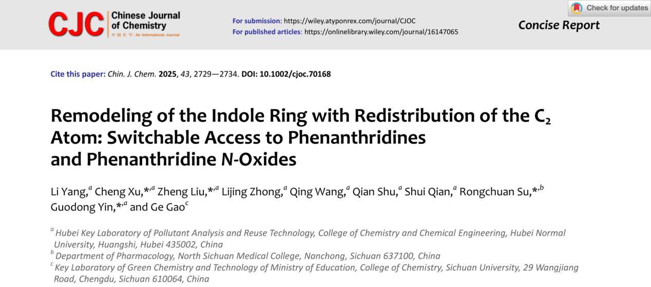 该成果于2025年7月作为封面文章发表于中科院SCI大类一区期刊Chinese Journal of Chemistry(IF:5.5),2023级硕士研究生杨丽为论文第一作者,殷国栋教授、徐程副教授、刘郑副教授和川北医学院苏蓉川博士为论文通讯作者,湖北师范大学为论文第一通讯单位。
