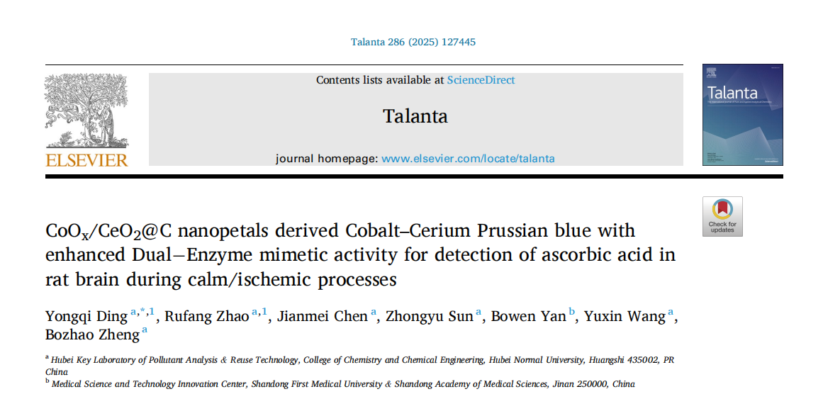 [成果3] 丁永奇:基于钴-铈普鲁士蓝衍生物的CoOx/CeO2@C纳米花瓣用于检测小鼠大脑中平静缺血过程中的抗坏血酸