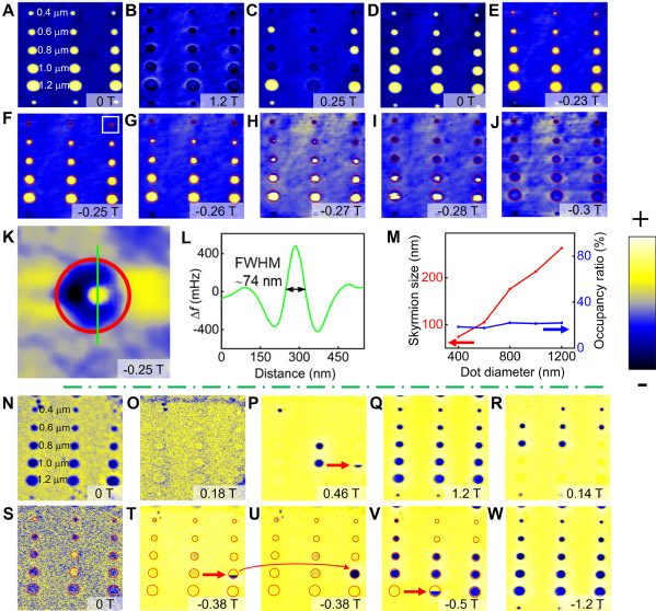 成果一:实现对单个斯格明子的可寻址、高精度调控,特别是在室温条件下的稳定操控,是该领域面临的最核心问题。本研究基于Co/Pt多层人工反铁磁耦合纳米盘阵列结构,通过自研高灵敏磁力显微镜系统,在室温条件下引入周期性局域振荡磁场,实现了对单个斯格明子尺寸的连续、可分辨调控。实验结果表明,在保持外加静态磁场不变的情况下,仅通过局域周期性磁场扫描操作,即可实现斯格明子尺寸从数百纳米连续缩小至数十纳米,尺寸缩小接近一个数量级。同时,斯格明子的写入、删除以及局部形貌精细调控均可实现,展示出优异的可控性和可重复性。该研究为拓扑自旋结构的工程化应用和低功耗自旋电子学发展提供了新的实验基础。该研究成果以“Giant Tunability of Individual Magnetic Skyrmion Size Via an Oscillating Local Magnetic Field”为题,发表在Rare Metals(中科院一区,TOP期刊,IF=11)上,并且,该工作被选为期刊封面。谢彩红博士为论文第一作者,南京师范大学马付胜教授、中国科学院强磁场科学中心冯启元副教授、中国科学技术大学陆轻铀教授为论文共同通讯作者。湖北师范大学光电转换材料与器件湖北省重点实验室、材料科学与工程学院为第一通讯单位。