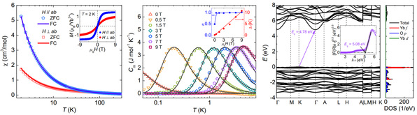 成果二:三角晶格反铁磁体作为一种典型的几何阻挫体系,有望承载包括量子自旋液体在内的多种新奇量子态。然而,真实的量子自旋液体候选材料中常存在结构无序问题,阻碍了对其本征物理的精确解读。本研究设计合成了一种结构理想的新型三角晶格稀土化合物K2CsYb(PO4)2,并成功制备出高质量的单晶样品。直/交流磁化率测量揭示了明显的磁各向异性,但低温下未观测到磁相变或自旋冻结,其量子顺磁行为也得到了极低温比热测量的证实。结合第一性原理计算所给出的强自旋轨道耦合和有效自旋1/2的基态性质,研究认为该材料具备实现量子自旋液体的潜力。此外,系统中存在大量的低温磁熵,可受磁场的连续调制。这一发现不仅为探索量子自旋液体物理提供了一个结构理想的新平台,也为极低温固态制冷技术的应用提供了有效载体。该研究成果以“Magnetic anisotropy and spin-disordered ground state in the triangular-lattice antiferromagnet K2CsYb(PO4)2”为题,2026年1月发表于Physical Review B [PRB 113, 035157 (2026)]。我校研究生童新安和陈英琦为论文共同第一作者,马祯副教授、南京邮电大学王巍副教授和南京大学温锦生教授为共同通讯作者。