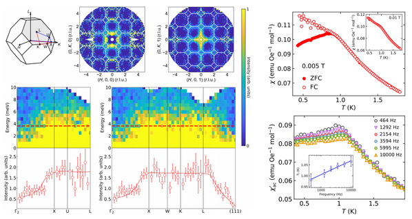 成果三:除了三角晶格之外,尖晶石结构中也存在几何阻挫,是实现量子自旋液体的潜力候选体系之一。然而,当前结构无序对自旋液体行为的影响仍存在争议。本研究结合中子散射、磁化率和比热等实验手段,对有明显结构无序的尖晶石单晶CuGa2O4进行了系统性研究。实验发现,即使温度低至80 mK 时体系仍无长程磁序建立,且非弹性中子散射实验测到了沿布里渊区边界的连续磁激发谱,这与量子自旋液体中期望的分数化准粒子激发一致。然而,直/交流磁化率曲线在0.88 K处发现短程关联和自旋冻结现象,说明其基态并非量子自旋液体。以上结果不仅揭示了结构无序可以塑造材料的自旋动力学行为,也为进一步寻找结构理想的量子自旋液体材料提供了重要参考。该研究成果以“Disorder-induced spin excitation continuum and spin-glass ground state in the inverse spinel CuGa2O4”为题,2025年7月发表于Physical Review B [PRB 112, 035128 (2025)]。我校马祯副教授、美国布鲁克海文国家实验室顾根大教授J. M. Tranquada教授,以及南京大学温锦生教授为共同通讯作者。